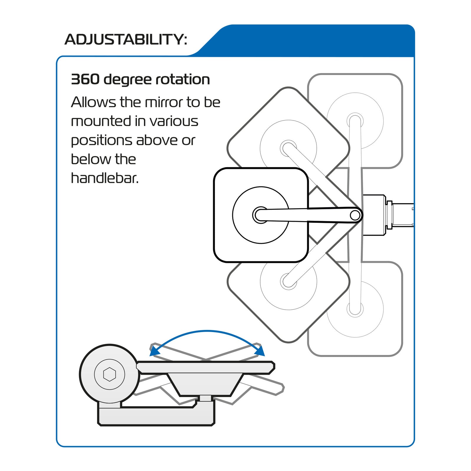 • 360° rotation: allows the mirror to be mounted at either end of - and positioned above or below - the handlebar.