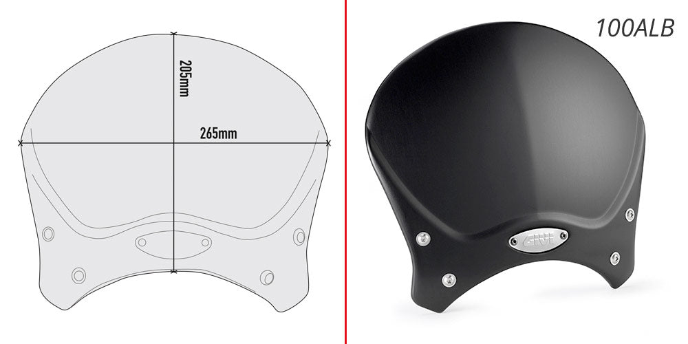 100ALB - Black anodized aluminium universal screen Race Cafe, for naked motorcycles 20,5 x 26,5 cm (H x W) to be combined with the specific AL6419A fitting kit